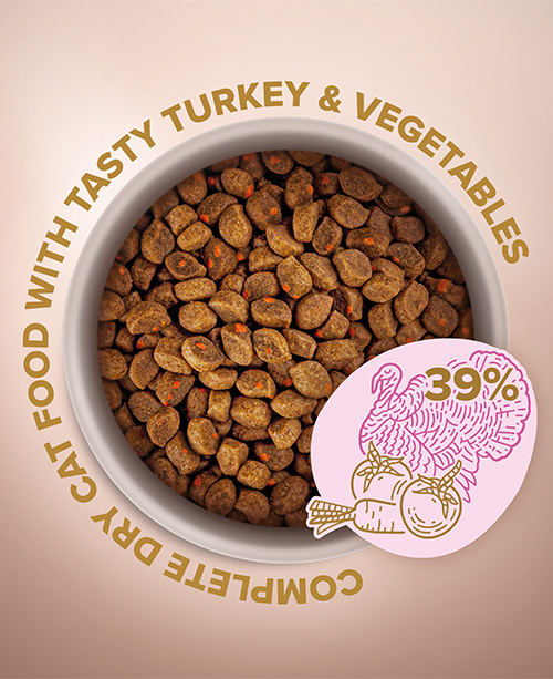 • Visok sadržaj mesa: Sadrži 39% mesa i mesnih derivata peradi, 4% ćuretine, kao bogat izvor visokokvalitetnih proteina.