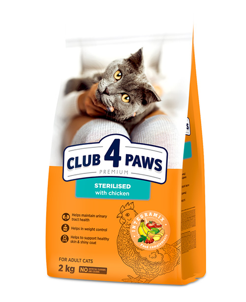 CLUB 4 PAWS CAT Sterilised je kompletna suva premium hrana, specijalno formulisana za odrasle sterilizovane mačke. Zahvaljujući pažljivo odabranim sastojcima, uključujući visokokvalitetan protein piletine, pomaže u održavanju idealne telesne mase, zdravlja mokraćnog trakta i opšte vitalnosti ljubimca.